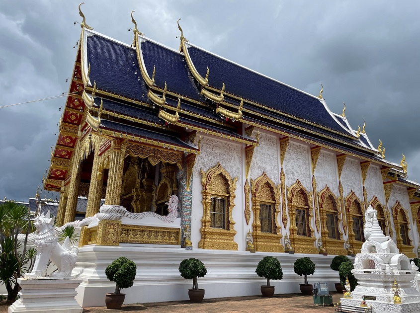 Wat Ban Den stands out from all of them. It is definitely my favourite place in the entire area. I had no expectations or idea what I would find; all I saw on the map was that there were a couple of temples. Striking colours (especially if you visit before a storm), gorgeous silhouettes, millions of details, and playful wind chimes await and take you on a trippy journey.