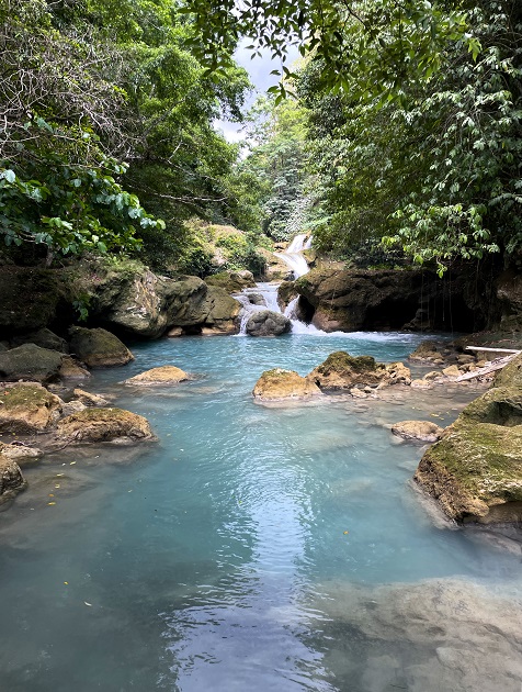 It’s a fun 15-minute trek to the destination – jumping on big stones, balancing planks and branches, and crossing the stream back and forth. There is a narrow trail on the side, but snakes live there, so it’s better to stick to the water path. The first sight of the milky blue water was already promising, but the waterfall left me speechless (and not just because the humidity in the jungle was suffocating). It’s a prime example of the perfect waterfall-chasing experience.