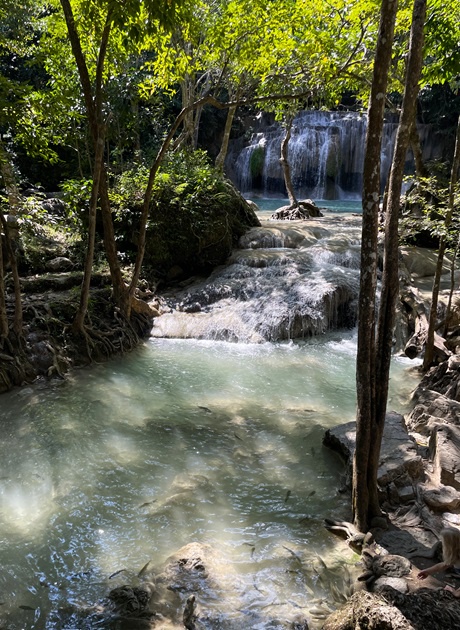 Erawan National Park is the highlight of the region, which means crowds. If you have your own bike and arrive when the gate opens at 8 am, you’ll have a kinda unspoiled experience. Otherwise, you’ll get stuck between groups and wait in line to take the same shot as everyone else. Entry is 300 THB (+ vehicle, 20 THB for bikes), it’s moderate trekking up to the seventh level of the famous waterfall, the water is beyond refreshing (for me, the knee-deep water was too cold to dive in), and it’s full of fish.